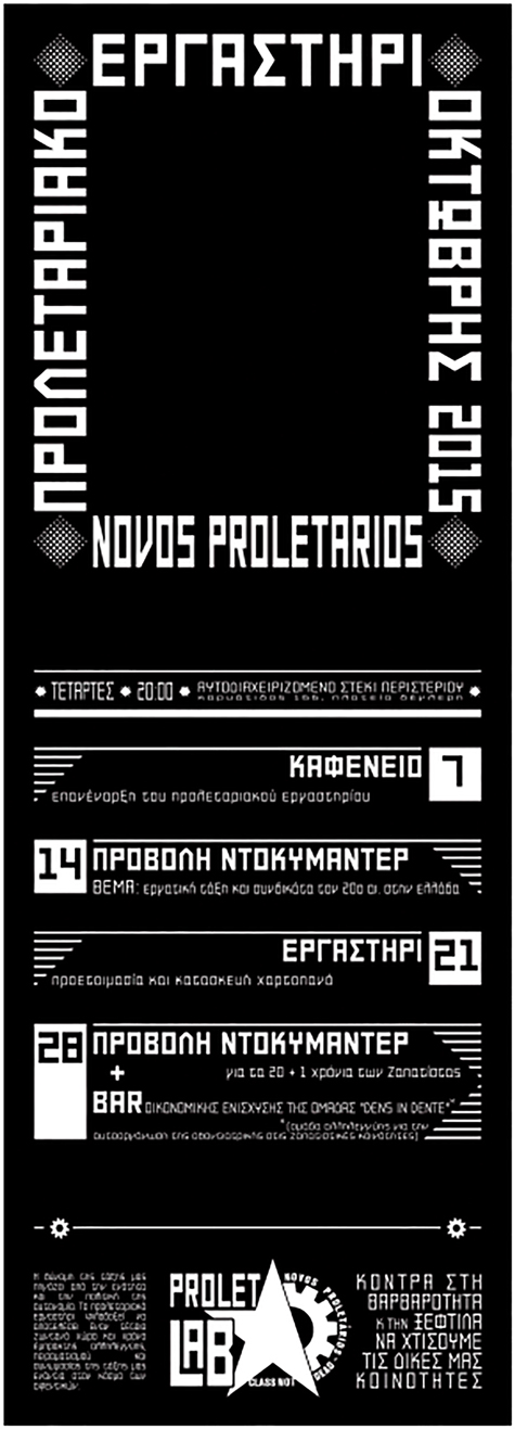 > Τον Οκτώβρη θα πραγματοποιηθούν στα πλαίσια του προλεταριακού εργαστηρίου στο Αυτοδιαχειριζόμενο Στέκι Περιστερίου (Καρυάτιδος 166, πλ. Δέγλερη) τα παρακάτω: