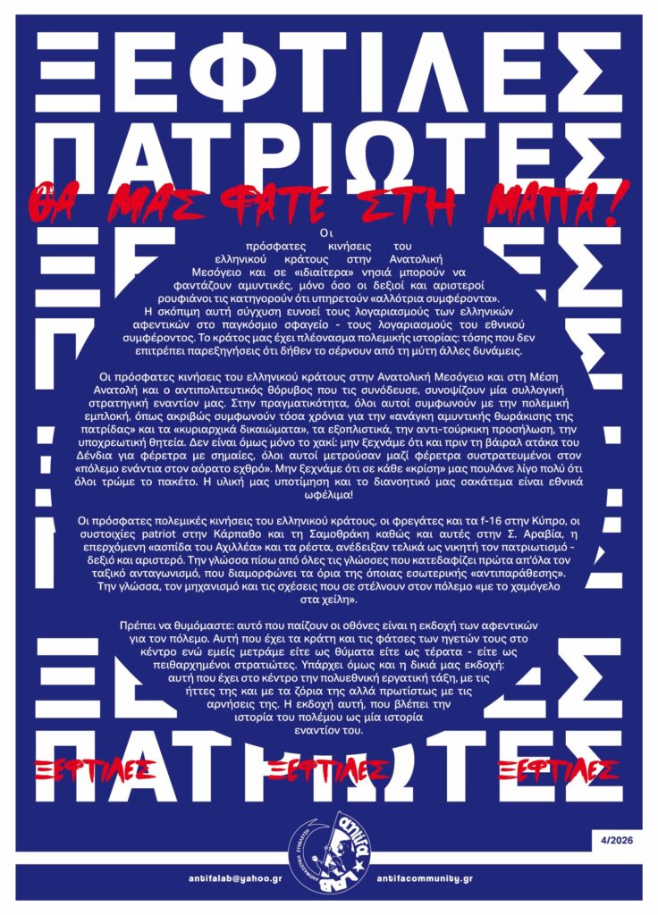 Οι πρόσφατες κινήσεις του ελληνικού κράτους στην Ανατολική Μεσόγειο και στη Μέση Ανατολή και ο αντιπολιτευτικός θόρυβος που τις συνόδευσε, συνοψίζουν μία συλλογική στρατηγική εναντίον μας. Στην πραγματικότητα, όλοι αυτοί συμφωνούν με την πολεμική εμπλοκή, όπως ακριβώς συμφωνούν τόσα χρόνια για την «ανάγκη αμυντικής θωράκισης της πατρίδας» και τα «κυριαρχικά δικαιώματα», τα εξοπλιστικά, την αντι-τούρκικη προσήλωση, την υποχρεωτική θητεία. Δεν είναι όμως μόνο το χακί: μην ξεχνάμε ότι και πριν τη βάιραλ ατάκα του Δένδια για φέρετρα με σημαίες, όλοι αυτοί μετρούσαν μαζί φέρετρα συστρατευμένοι στον «πόλεμο ενάντια στον αόρατο εχθρό». Μην ξεχνάμε ότι σε κάθε «κρίση» μας πουλάνε λίγο πολύ ότι όλοι τρώμε το πακέτο. Η υλική μας υποτίμηση και το διανοητικό μας σακάτεμα είναι εθνικά ωφέλιμα!