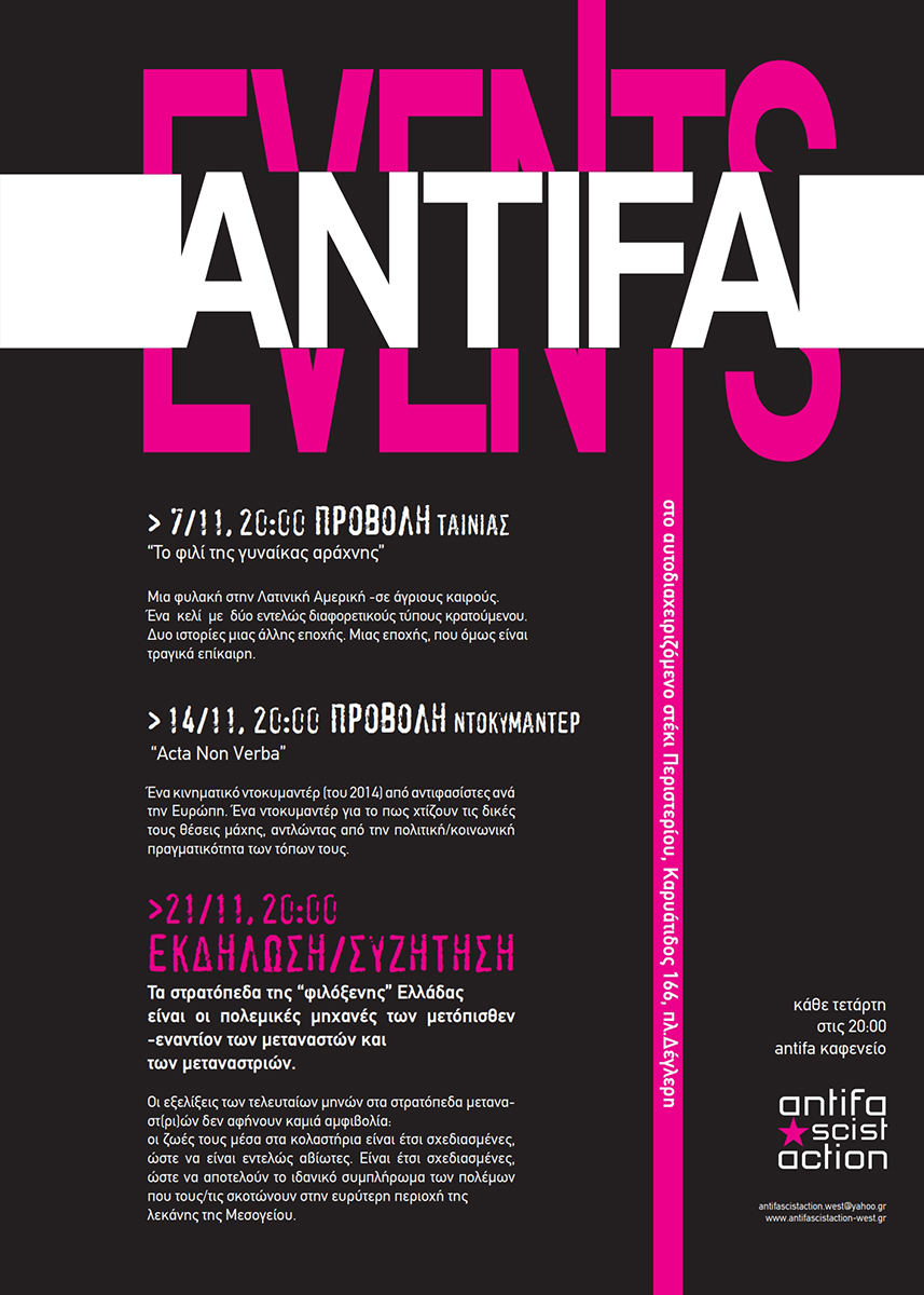 >>Κάθε Τετάρτη στο χώρο του στεκιού από τις 20:30 έως τις 23.00 πραγματοποιούνται antifa events (πχ. ανοιχτή συζήτηση, workshop, προβολή, κ.α. ). Σε περίπτωση που δεν έχει ανακοινωθεί κάποιο event τις ίδιες ώρες θα λειτουργεί κανονικά το antifa καφενείο όπου σας καλούμε για χαλαρή κουβέντα και για να γνωριστούμε. Tυχόν εξαιρέσεις θα ανακοινώνονται ηλεκτρονικά. Επιπλέον, στο χώρο του στεκιού λειτουργεί δανειστική βιβλιοθήκη και διατίθονται κινηματικά έντυπα, εκδόσεις αλλά και αυτοκόλλητα.