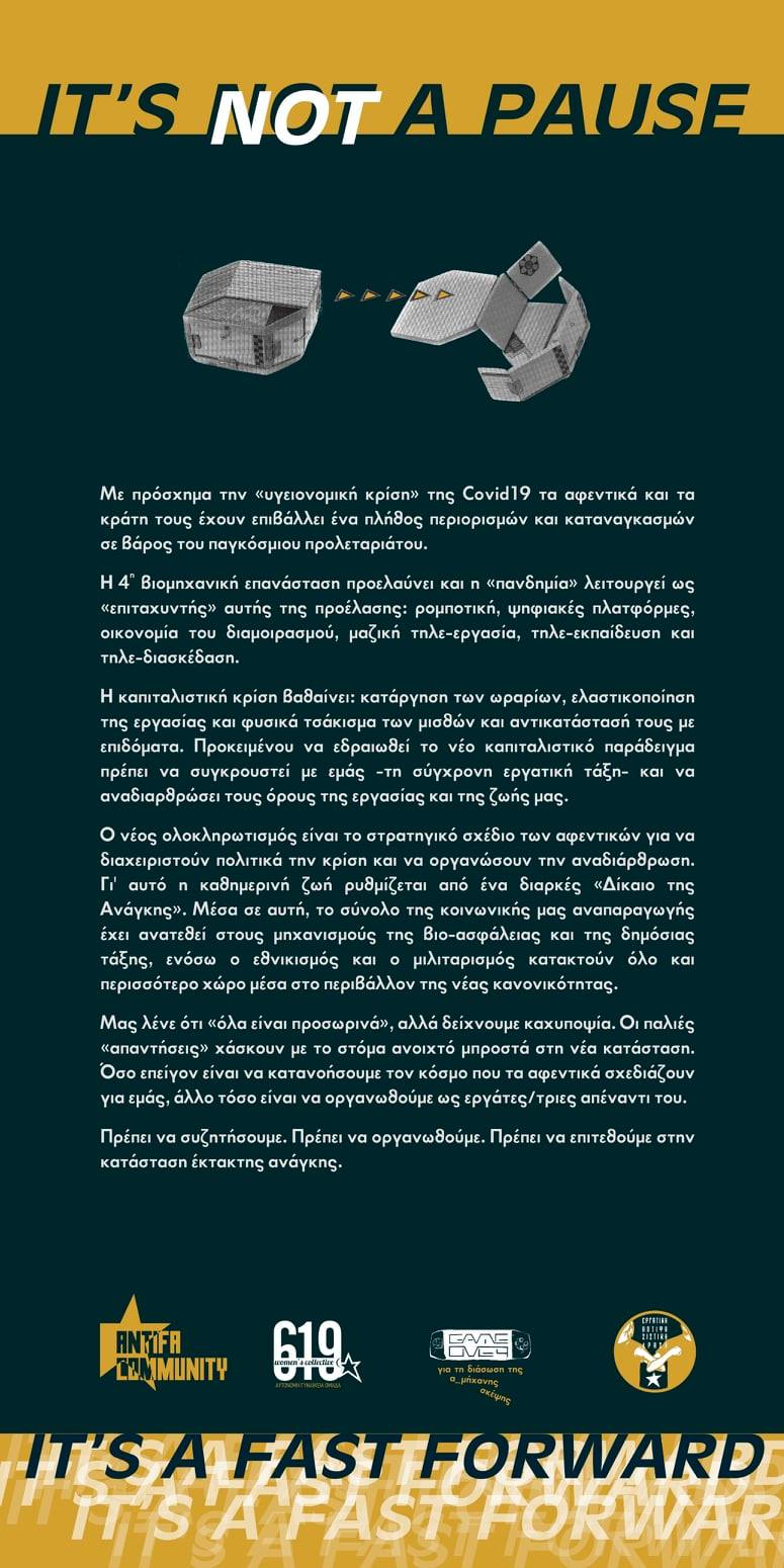 Ο νέος ολοκληρωτισμός είναι το στρατηγικό σχέδιο των αφεντικών για να διαχειριστούν πολιτικά την κρίση και να οργανώσουν την αναδιάρθρωση. Γι’ αυτό η καθημερινή ζωή ρυθμίζεται από ένα διαρκές «Δίκαιο της Ανάγκης». Μέσα σε αυτή το σύνολο της κοινωνικής μας αναπαραγωγής έχει ανατεθεί στους μηχανισμούς της βιο-ασφάλειας και της δημόσιας τάξης, ενόσω ο εθνικισμός και ο μιλιταρισμός κατακτούν όλο και περισσότερο χώρο μέσα στο περιβάλλον της νέας «κανονικότητας».